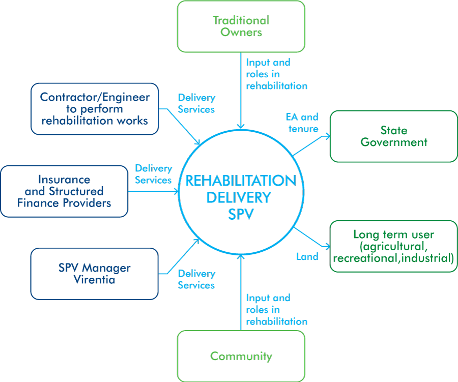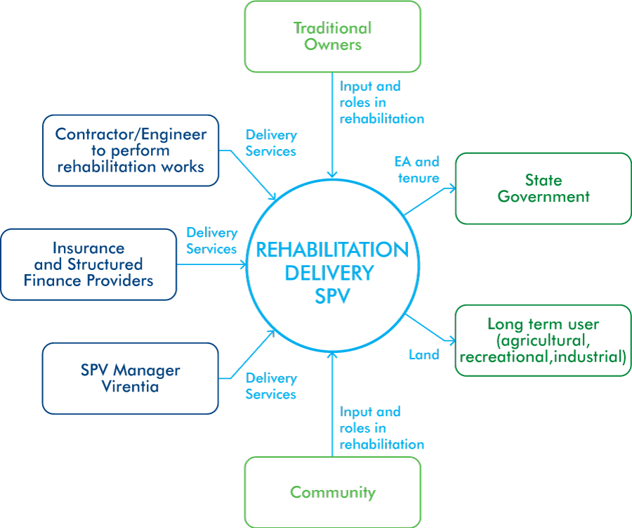 - Consortium of Manager (Virentia), Contractor, and Engineer establish an SPV* to acquire a mine site (the asset) for rehabilitation.